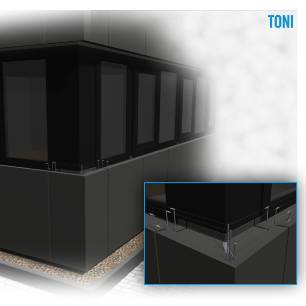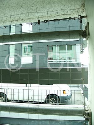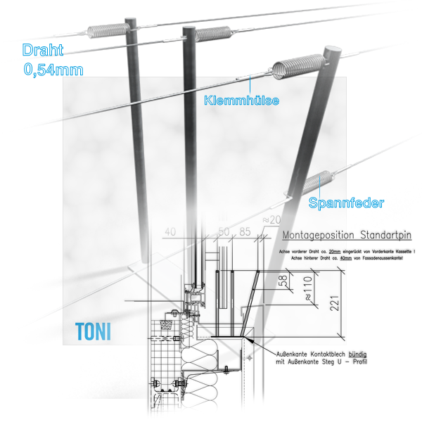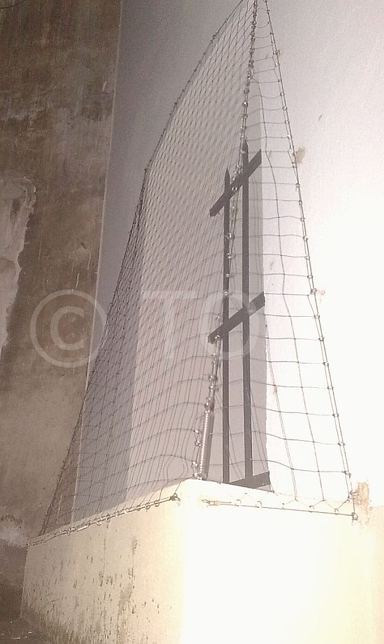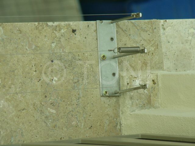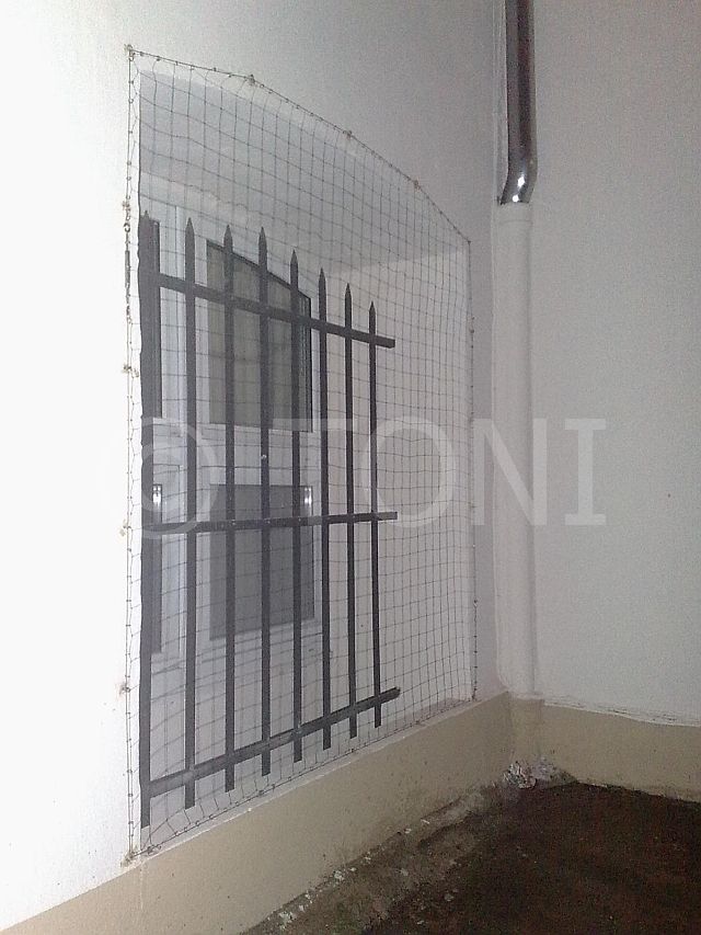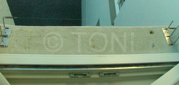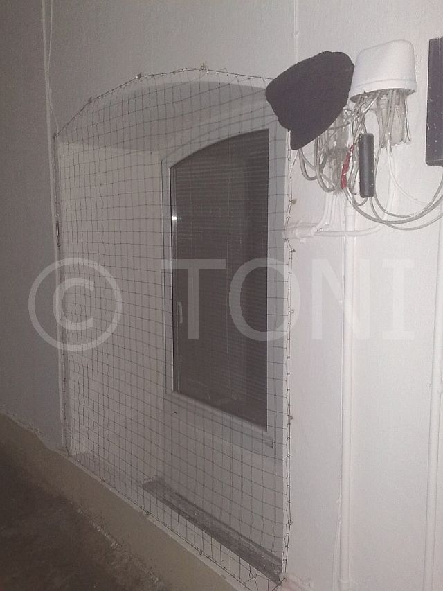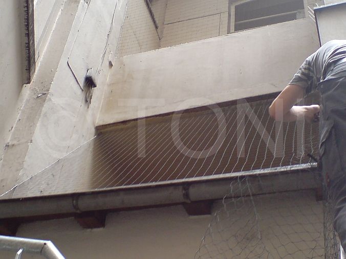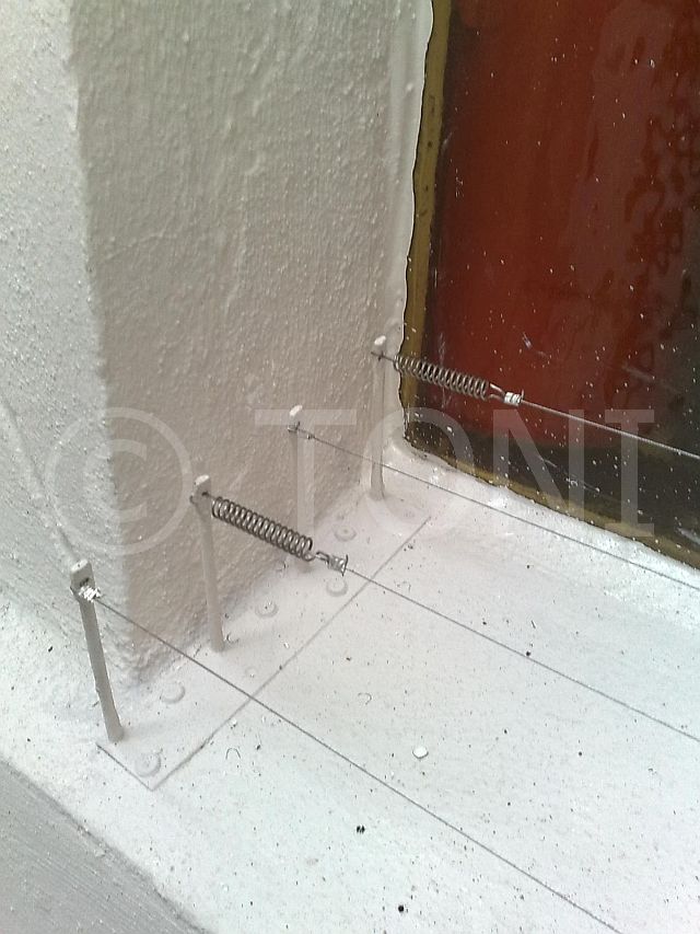 A multiple row stainless steel wire system was fitted exactly to the form of the window sills. Stainless steel pins were used. A possible alternative is also the direct anchoring of the wire system into the window reveals.