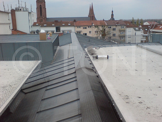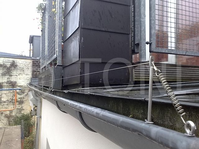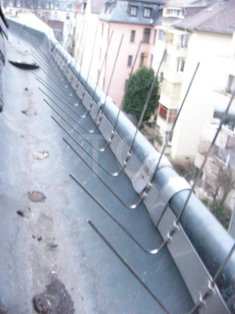 At this listed building at Ubierring in Cologne, we have installed a stainless stell wire system on gutters and ledges. The system was even painted in order to best integrate it into the facade of the building.
