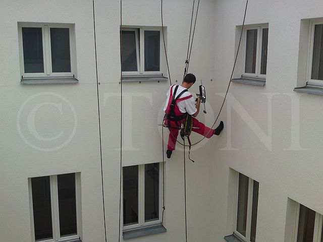 This courtyard of a block of houses in Frankfurt was heavily soiled by pigeons. Access was the problem; however our climbing team solved it with flying colours.