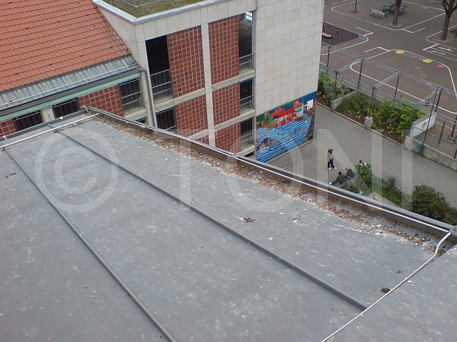 This inner courtyard of this new housing was protected with an electrical system against pigeons. The system is installed in the front attic in an area that is not easy to reach. Therefore, the occupants, children etc cannot reach the system and frighten themselves.
