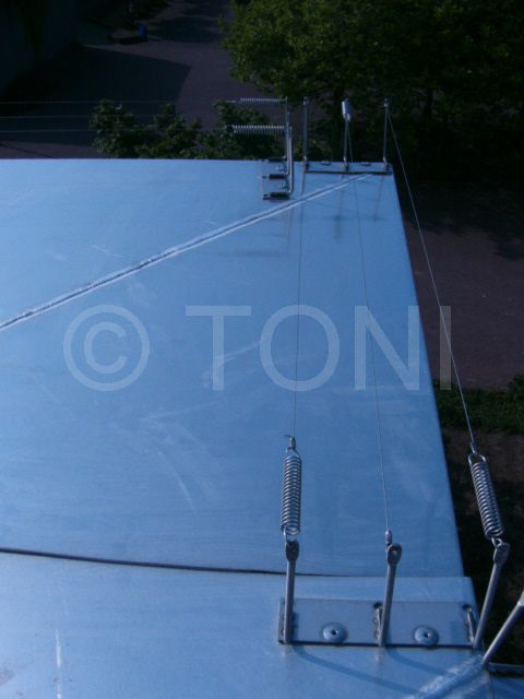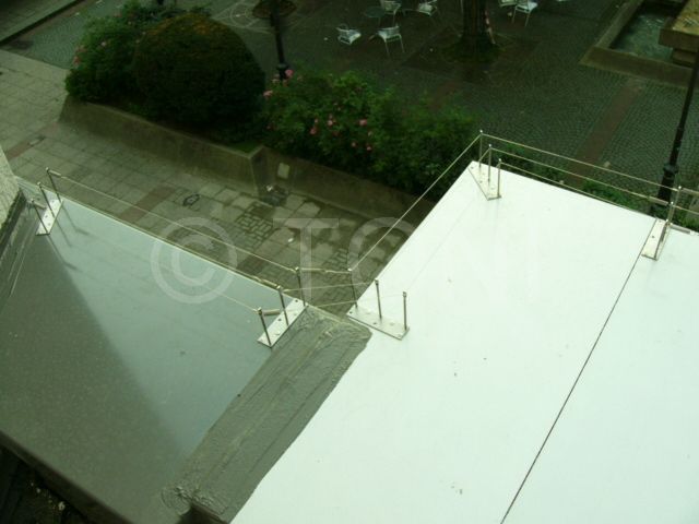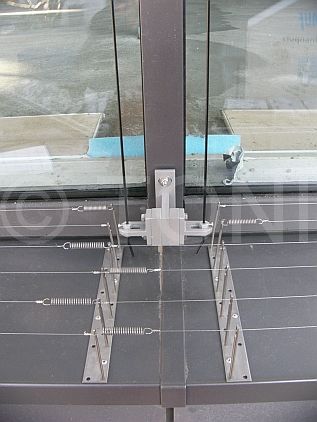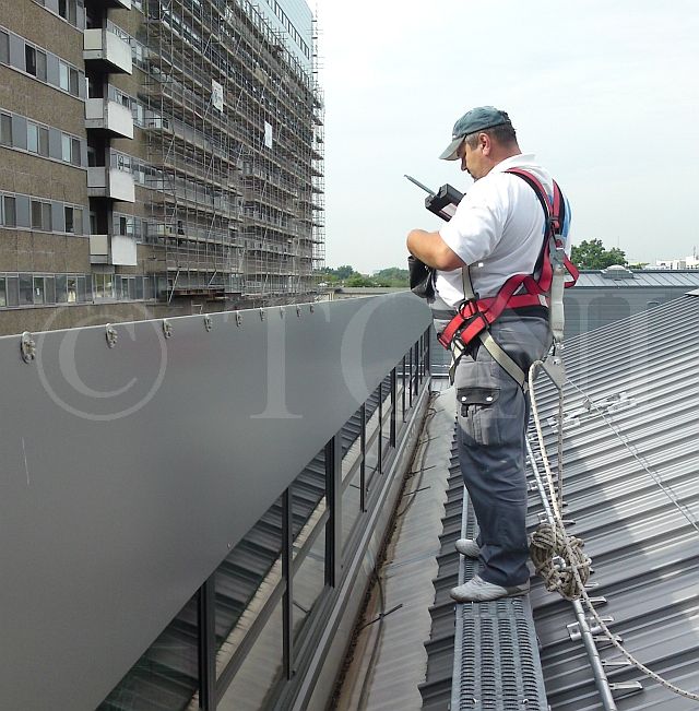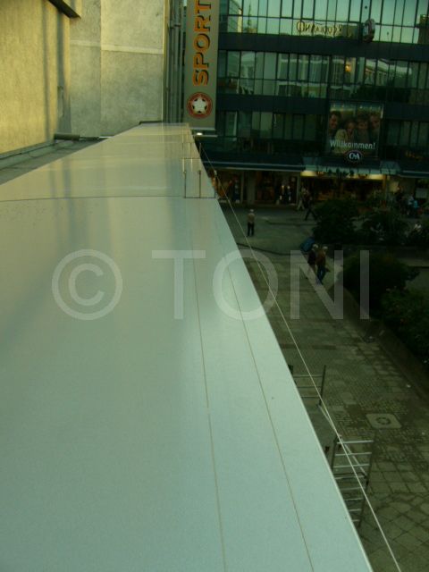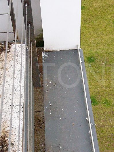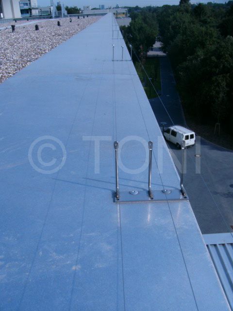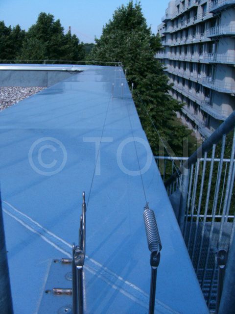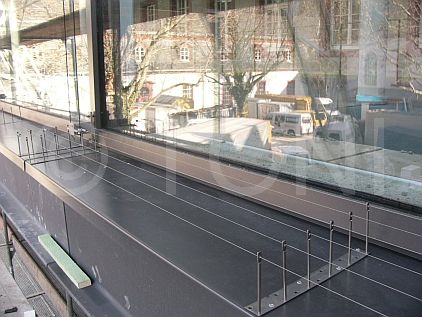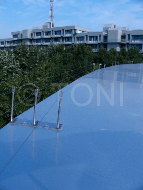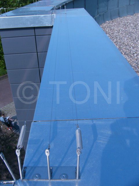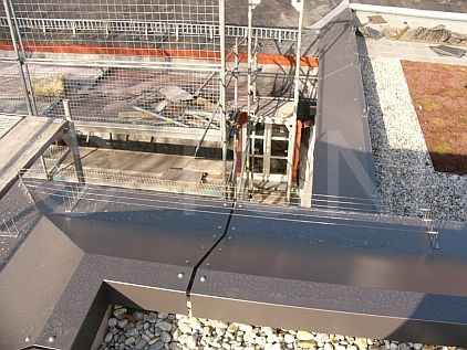For this purpose we assembled and fixed one after the other and under each other several segments – each of three stainless steel wires. Each segment protects ca. 18 – 20 m parapet. Direction changes at edges were achieved with oblique profiles.