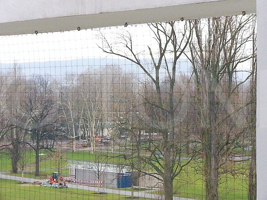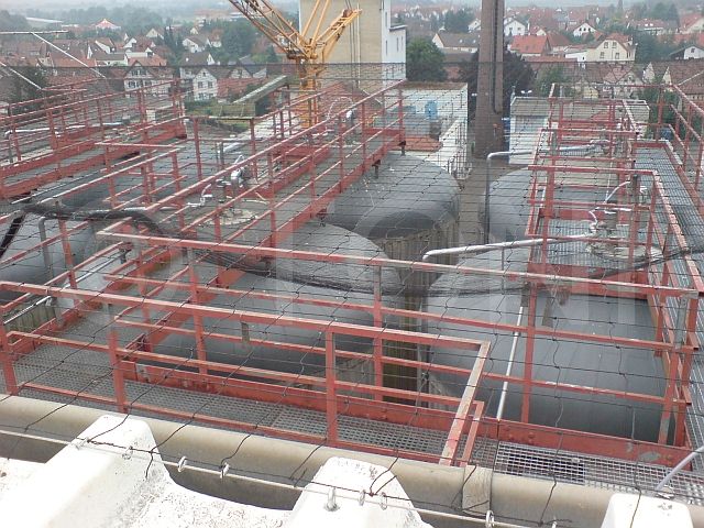 Netting was fixed over the forecourt of a hydroelectric power plant in Würzburg. The netting is hardly noticeable due to the choice of colour and mesh size.