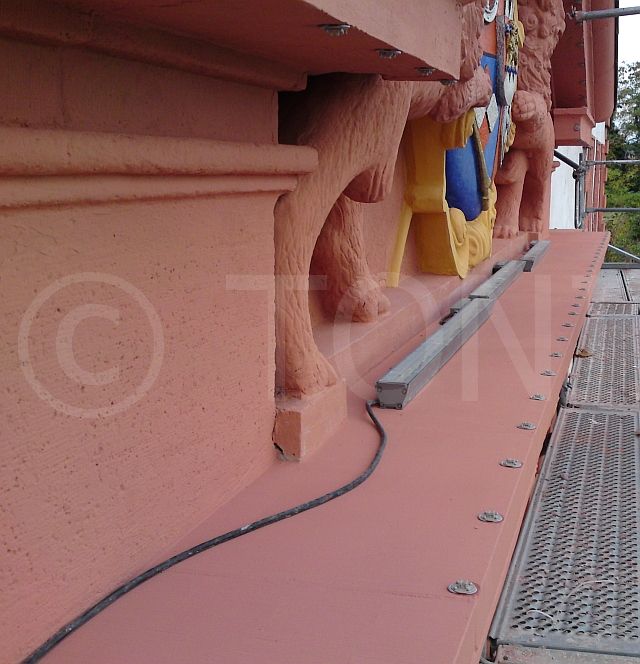 The historic listed monument and architecturally valuable hydroelectric power station in Würzburg had to be carefully protected against pigeon droppings. The TAPO profile electric system was selected, together with a special clamping system for the snow guards.