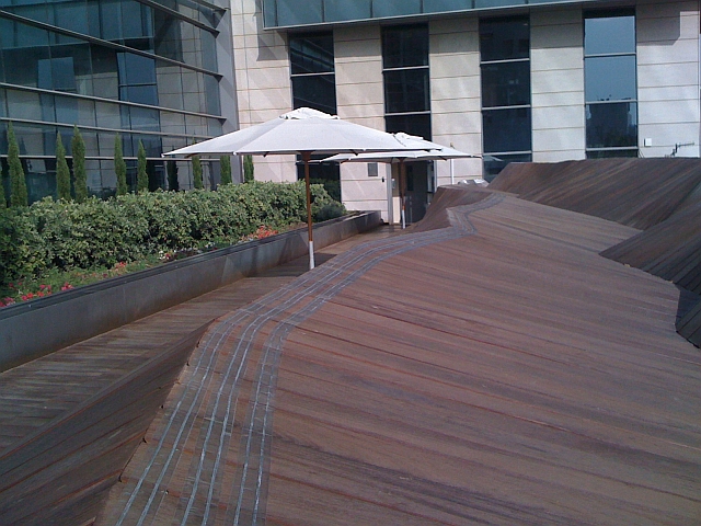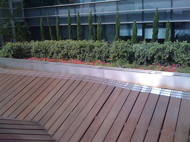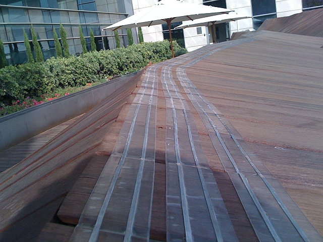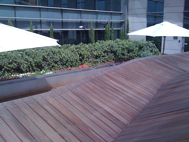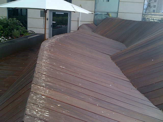 On this wooden structure, scaretape was applied to the edge only. The surface of the wood is treated.