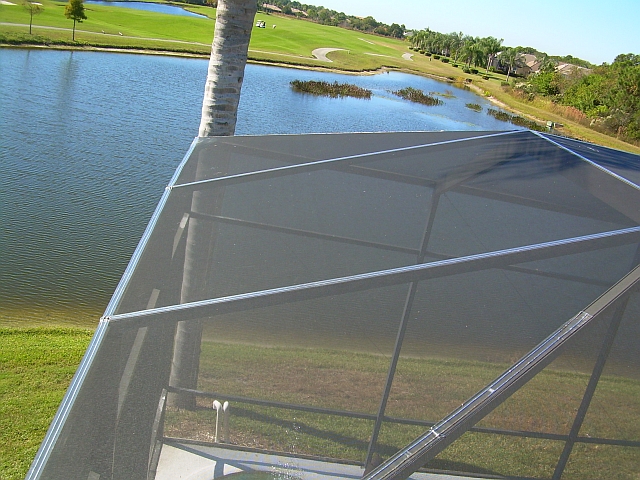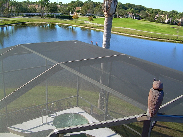 On a cage at a golf court in Florida, scaretape is installed for bird control - directly on top of the timber frame.