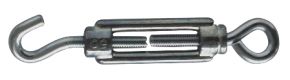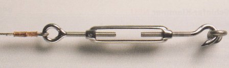 Turnbuckles are used to tension the cables of a cable frame construction.One side has a hook and the other an eyelet. Thus, the cable frame construction can be unhooked at any time, after it has been unwound.